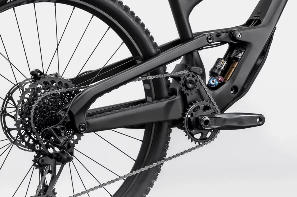 Wysoki punkt obrotu sprawia, że podczas ugięcia tylna oś przemieszcza się do tyłu, lepiej połykając nierówności. Damper w dolnej rurze obniża środek ciężkości. System 4-zawiasowy zachowuje płynność i trakcję również przy hamowaniu i zapewnia efektywne pedałowanie.